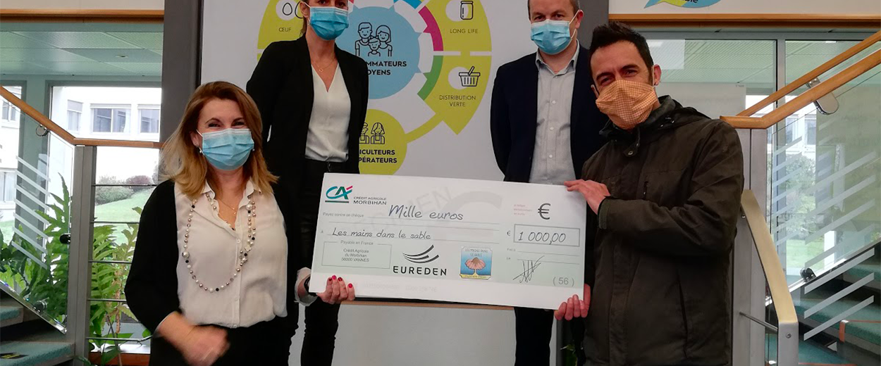 Au siège de la branche Eureden Long Life à Theix, Nicolas Ollivier, directeur des Ressources humaines, Stéphanie Giorgi, référente RSE de la branche Eureden Long Life et Karen Goulard, responsable RSE Eureden, ont remis un chèque de 1 000 euros à l’association Les mains dans le sable. L’association organise des nettoyages sur les plages du Finistère, du Morbihan, de la Vendée et de la Charente Maritime. Il ne s’agit pas seulement des déchets laissés sur la plage par les usagers, mais aussi des déchets que nous produisons tous avec notre style de vie et nos habitudes de consommation. En outre, l’association organise, dans les écoles ou les entreprises, des séances de sensibilisation à la pollution de la nature par l’homme, suivies, dans la plupart des cas, d’une collecte sur la plage.